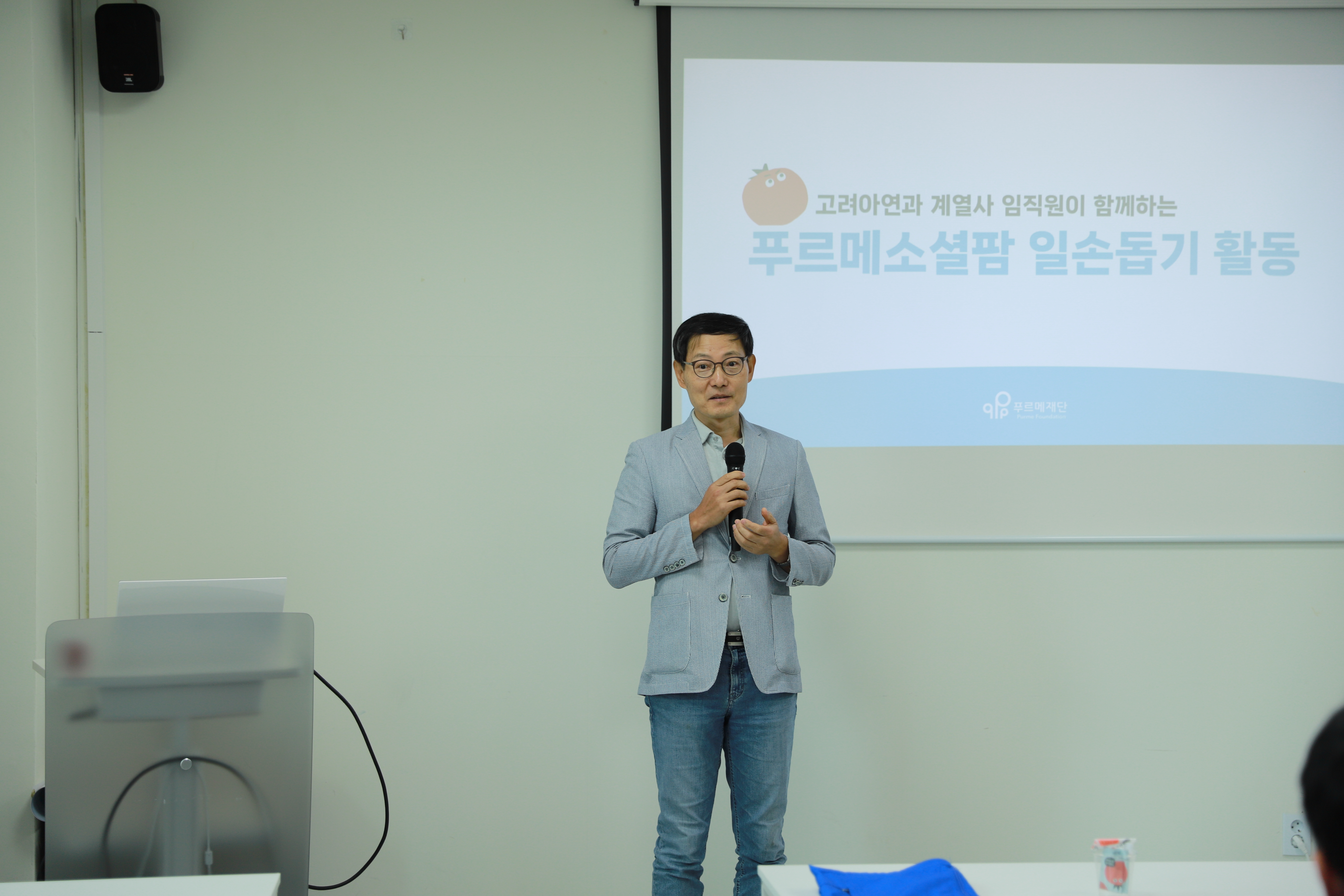 일정에 앞서 고려아연 경영관리그룹 정보보호팀 황인구 담당은 “장애인의 자립을 돕는 푸르메재단의 뜻에 크게 감동받았다. 오늘 봉사하면서 여러분도 같은 보람을 얻었으면 좋겠다.”라며 격려했습니다. 이어 봉사단은 발달장애인 직원들의 근무 환경과 재배 작물인 방울토마토에 대한 설명을 듣고, 현장을 둘러보면서 푸르메소셜팜을 더 알아가는 시간을 가졌습니다.