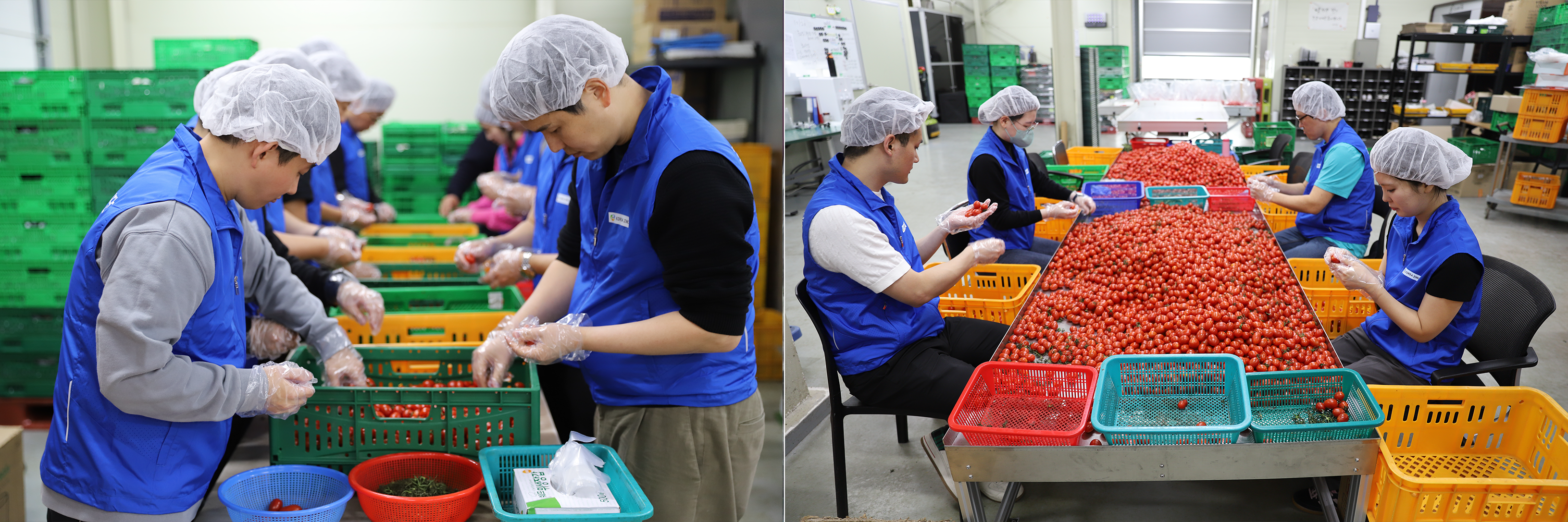 오후에는 가공동에서 방울토마토 선별 작업을 진행했습니다. 온실에서 수확한 방울토마토의 꼭지를 제거한 다음 크기와 용도에 따라 분류합니다. 봉사단의 꼼꼼한 손길이 닿은 방울토마토와 함께 푸르메소셜팜을 응원하는 마음도 가득 쌓였습니다.
